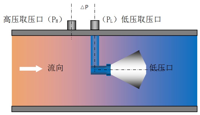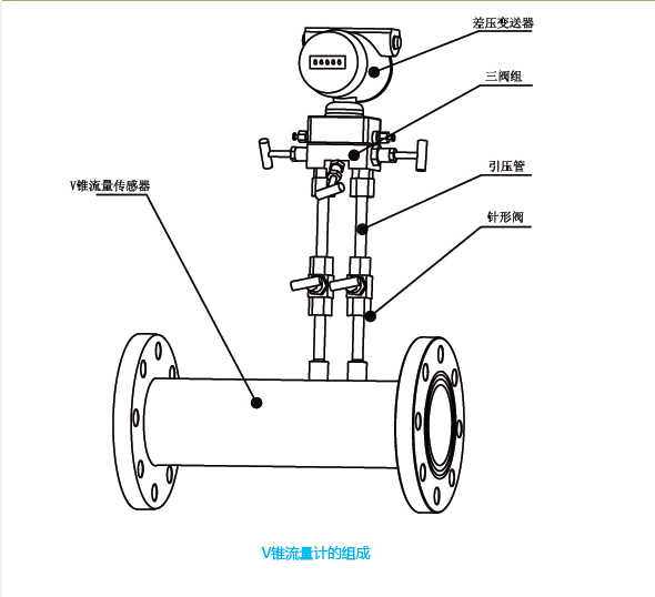 V形锥体和导流管是预先经过精密加工好的,流体在流经V锥体时,V锥体的结构和形状使得流体在收缩前有一个平滑的过度区,流体并不是被迫收缩到管道中心线附近,而是逐渐朝向管内边壁收缩,在前后两端会产生差压,配上相应的差压变送器和附件(三组阀、取压阀等)组成V锥流量计,从而测量出流量。