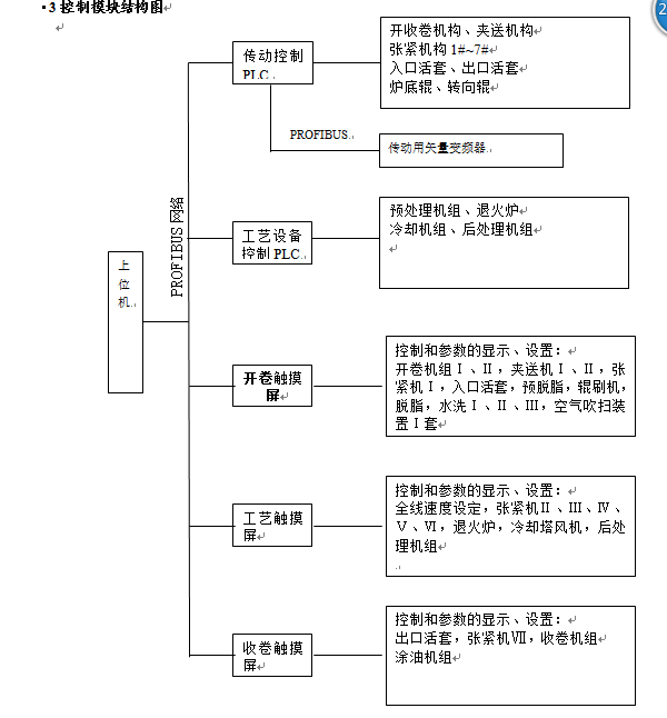 为了使生产线控制协调一致,整个控制系统采用两个PLC CPU控制,PLC为SIEMENS的SIMATIC S7-300 CPU,通过PROFIBUS网络连接CPU和触摸屏。控制系统中采用美国Madshen蘑菇影视在线观看品牌MDSC308E系列开关量输入/输出信号(DI/DO)约有720点,模拟量采用MDSC306E系列输入/输出信号(AI/AO)9点,通过现场总线将I/O模块联为一体。其中,传动系统的开收卷机构、张紧机构和储料机构,炉底辊机构的电机采用矢量变频器控制,并通过PROFIBUS-DP同PLC通讯。传动部分和工艺部分的普通交流电机根据容量的大小分成两种不同的起动方式:轻负荷设备的电机(功率在37KW以下)采用直接起动方式(即全压起动)、重负荷起动的电机(大于37KW)采用“星—三角”降压起动。